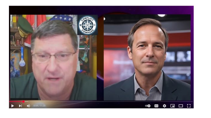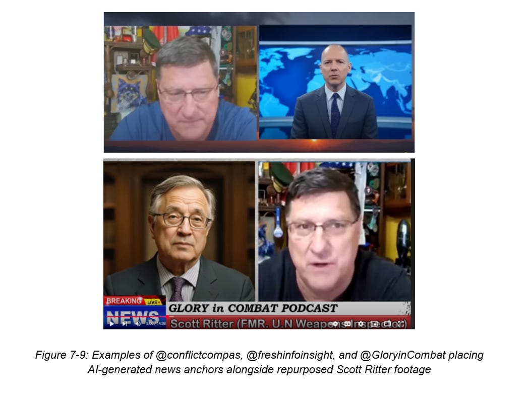 Figure 7-9: Examples of @conflictcompas, @freshinfoinsight, and @GloryinCombat placing AI-generated news anchors alongside repurposed Scott Ritter footage
