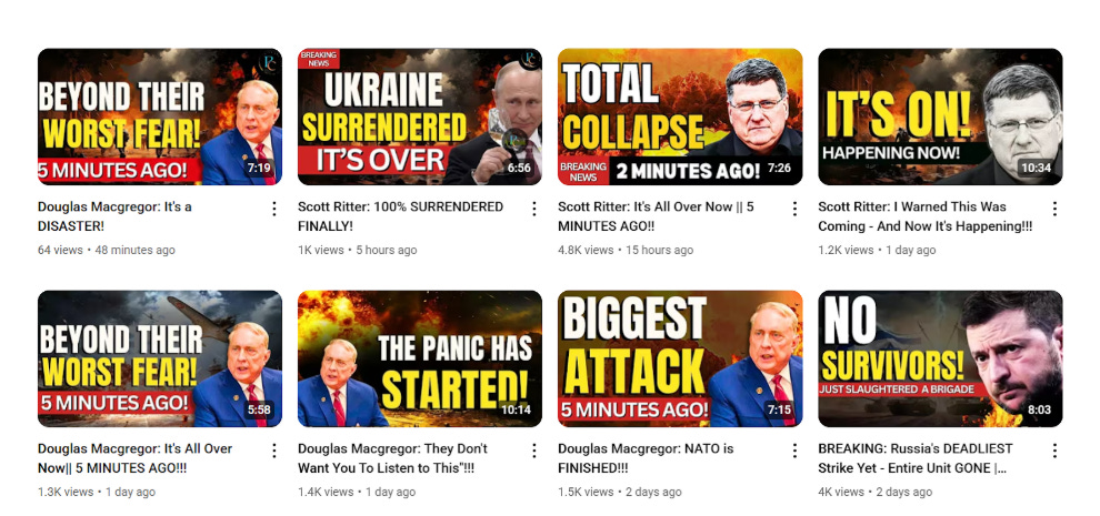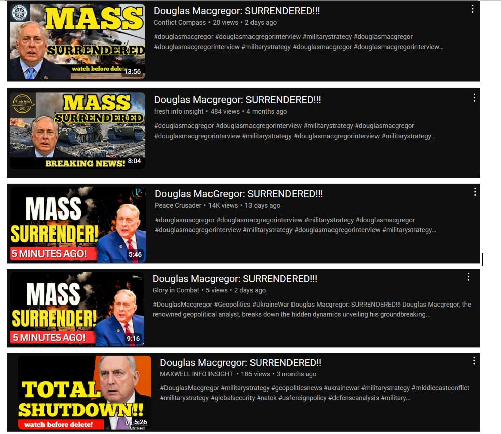 Many of the channels’ videos have identical titles such as “Douglas Macgregor: SURRENDERED!!!” and formulaic or identical thumbnails. We sampled titles from 200 videos, finding 65 titles were identical across 2 to 3 channels and 15 were identical across 4 to 5 channels. Repeated use of identical titles after long gaps suggests the operators use a preset list.
