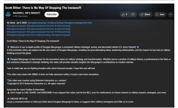The channels display clear signs of coordination. All five have nearly-identical biographies and primarily post edited content from previous interviews by Scott Ritter and Douglas Macgregor, both known for appearing on Russian state media and pushing pro-Kremlin narratives.