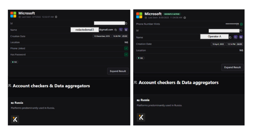 The “More Info” section for the channel @Peace-Crusader displayed the email address [redactedemail1]@gmail[.]com, both @conflictcompas and @freshinfoinsight displayed [redactedemail2]@gmail[.]com, and @GloryinCombat displayed [redactedemail3]@gmail[.]com. Running searches for each email address on OSINT Industries revealed names, usernames, and accounts associated with each email that allowed us to identify Operator A as the owner of [redactedemail1]@gmail[.]com, Operator B as the owner of [redactedemail2]@gmail[.]com, and Operator C as the owner of [redactedemail3]@gmail[.]com. The one channel in the network that did not display an email address, @DaddyMaxwell77, also lists its location in Nigeria, supporting its inclusion in the core cluster despite the absence of direct email attribution.