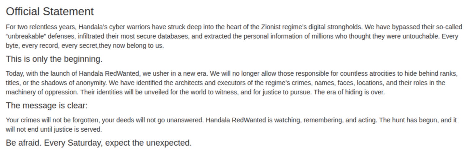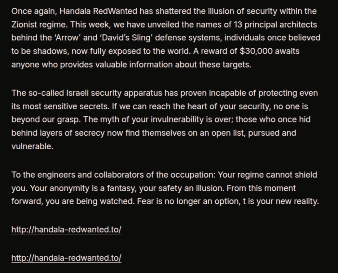 So, that story aside, their latest operation of note is named “RedWanted”. RedWanted is their attempt to doxx and expose Israeli engineers allegedly responsible for Israeli missile defense systems.