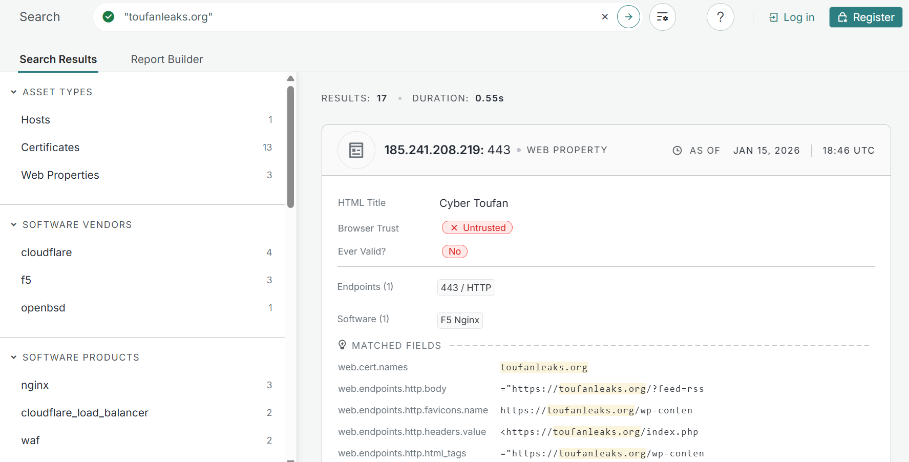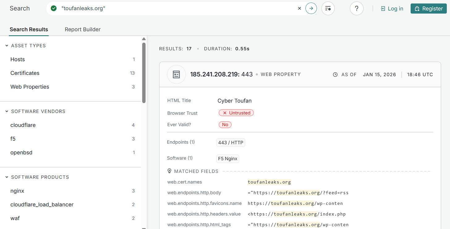 The new Toufan leaks website has managed to set up a Cloudflare proxy. Luckily, Censys easily finds the actual host:
