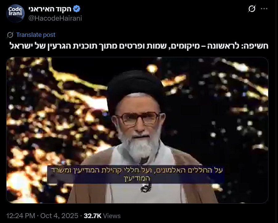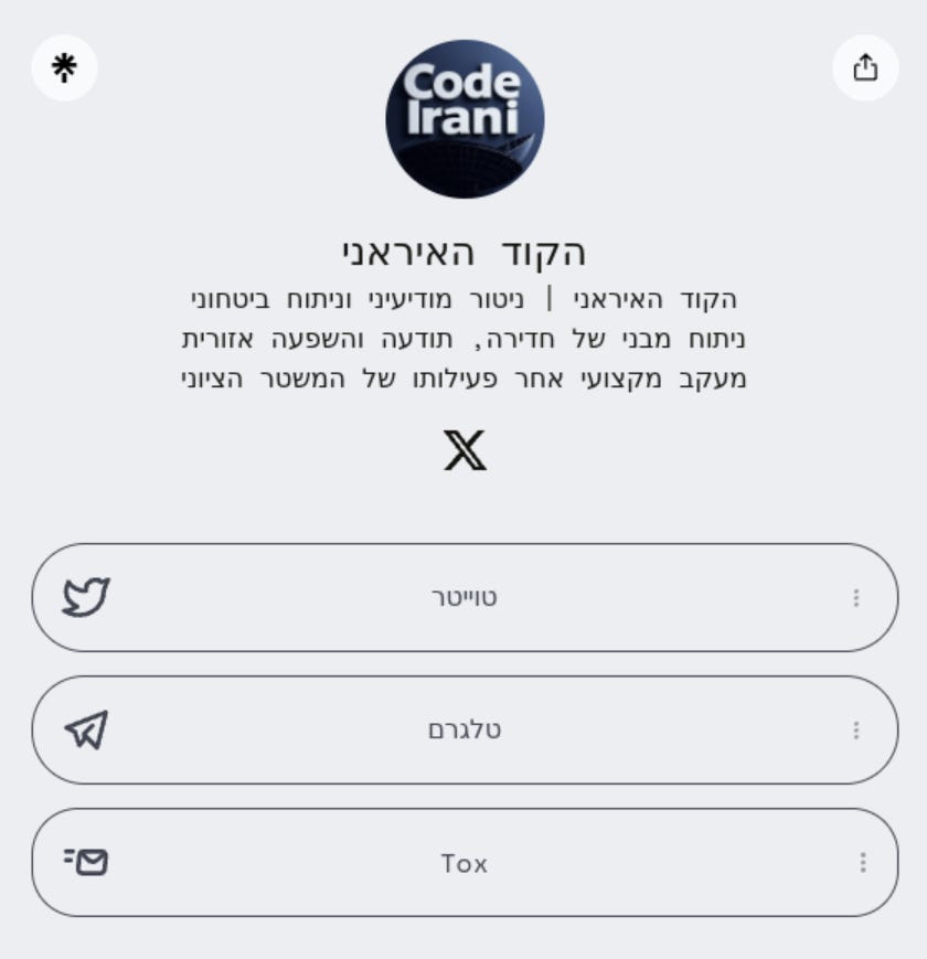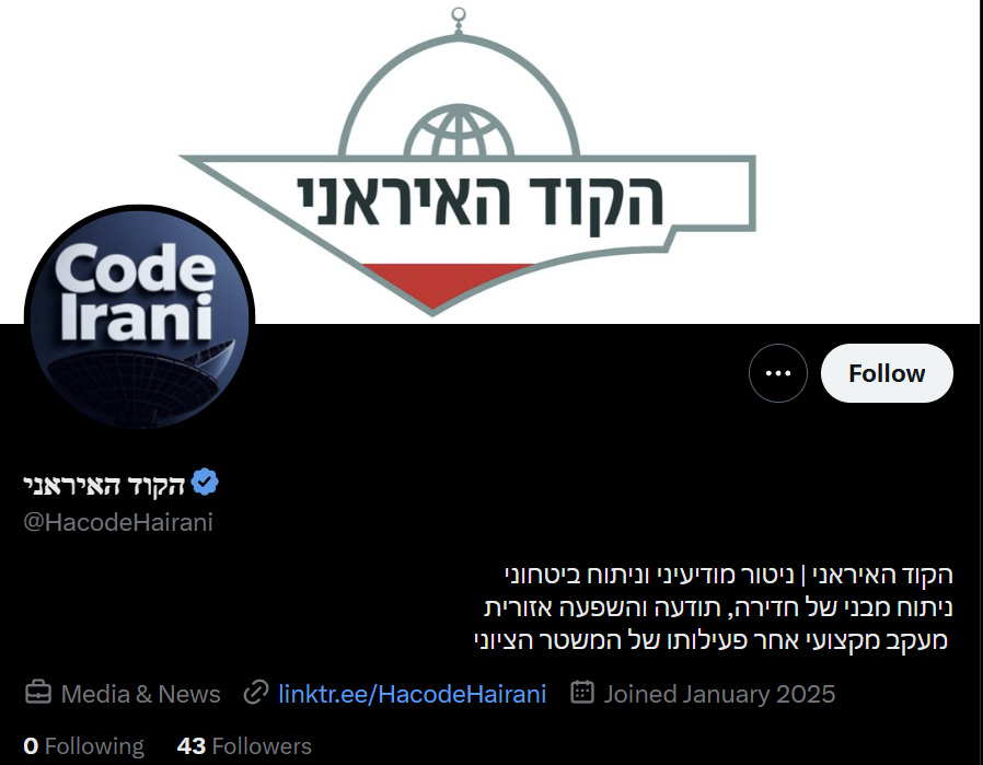 The operation, called “The Iranian Code” in Hebrew, and describes its objectives in its about section: “intelligence monitoring”, “security monitoring”, “regional influence”, “professional tracking of the Zionist regime”.