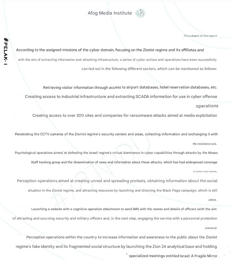 The document describes their operational goals in targeting Israel in a cyber-enabled IO perspective, such as: