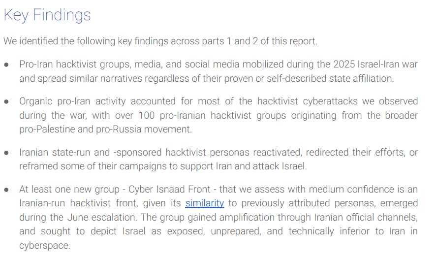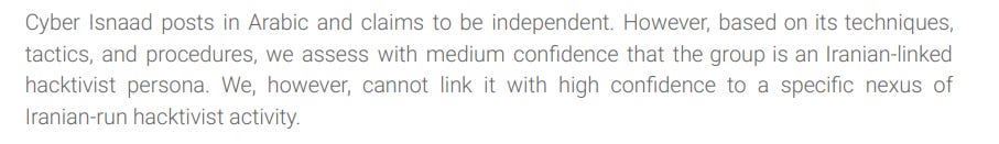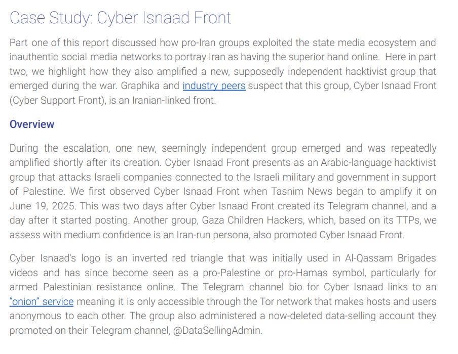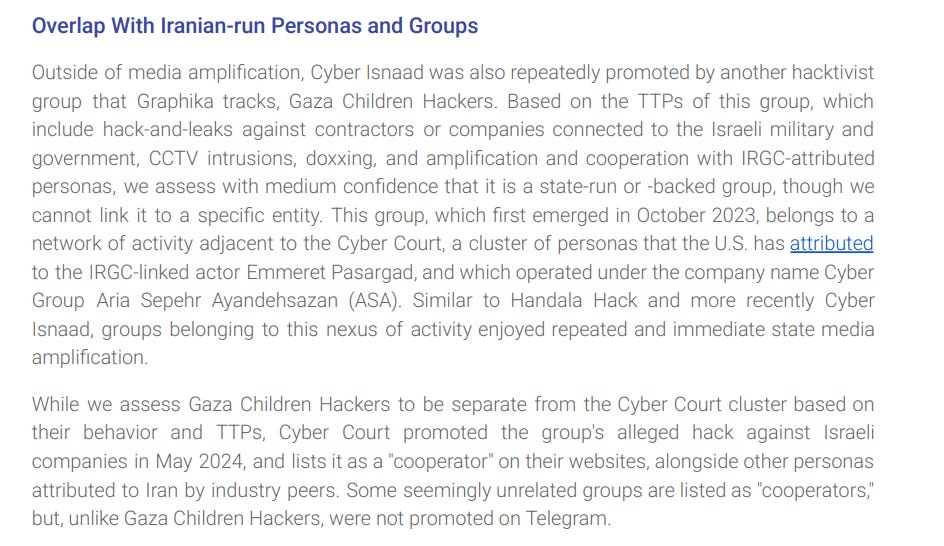 The next piece we’ll look at is Graphika’s latest look at Iranian hacktivist fronts, a topic near and dear to my heart, available here. This is a follow up to their previous report on the topic, link available in the report. Key findings below: