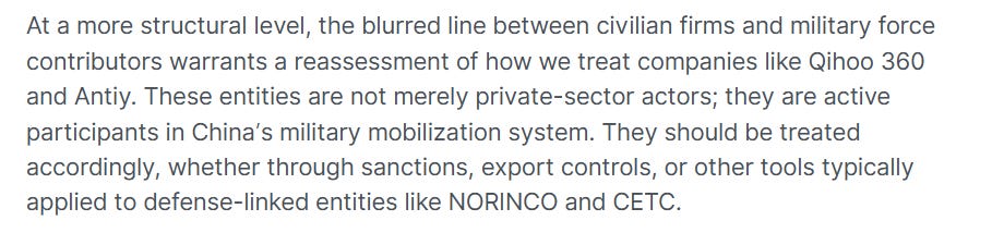 That means that companies that we’ve discussed here such as Qihoo 360 aren’t necessarily “just” private-sector firms working in the interests of China, but rather may be integrated actively into Chinese defense efforts.