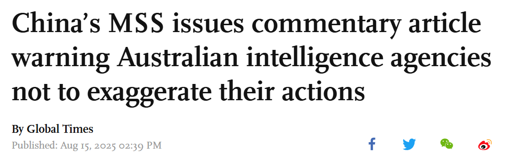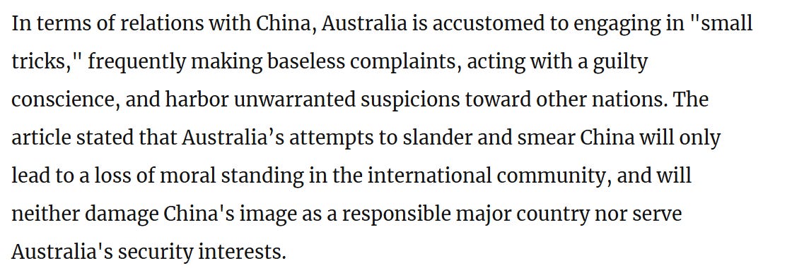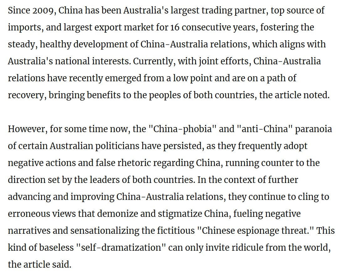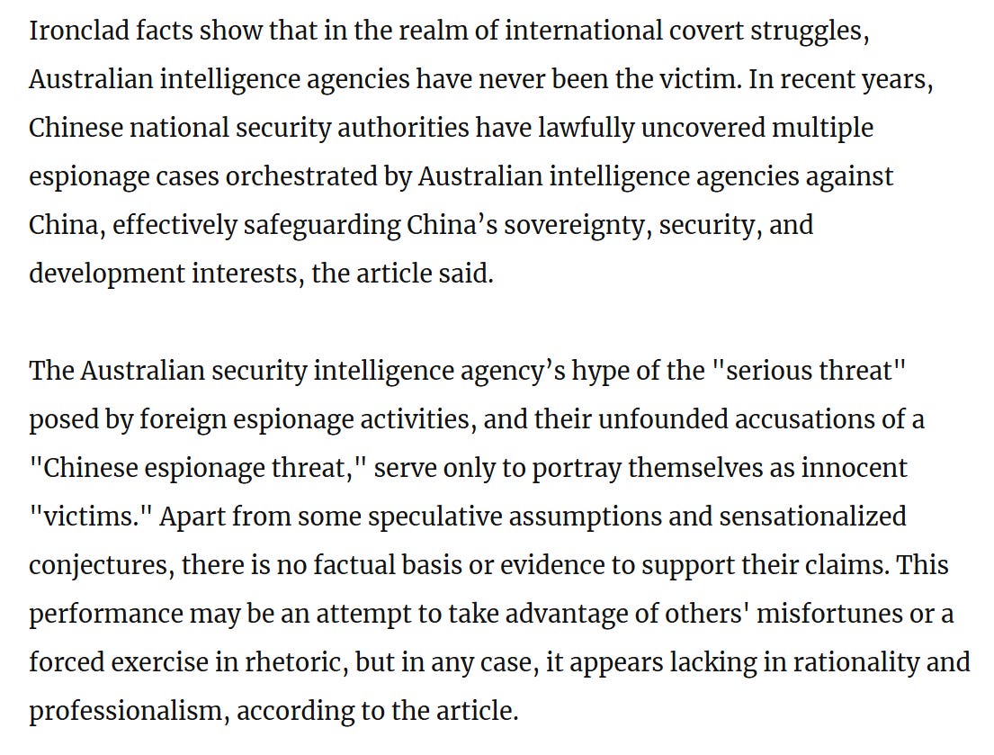 Lastly and in seemingly classic fashion by now, the Chinese claim to have legally uncovered multiple cases of Australian espionage.