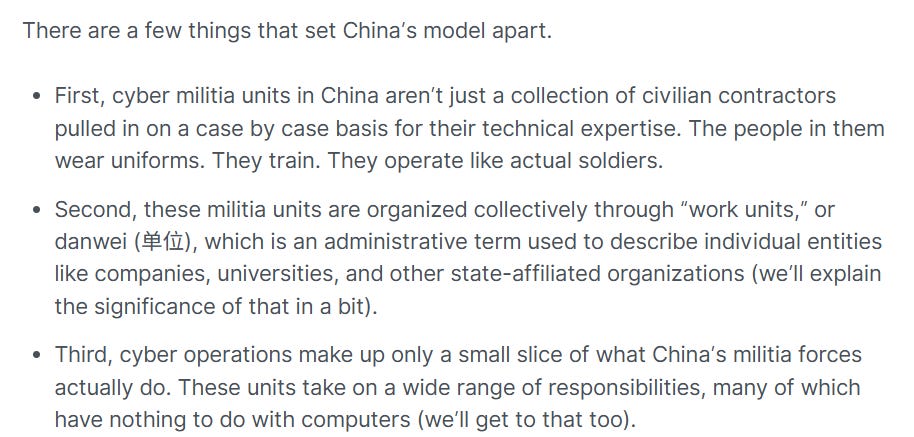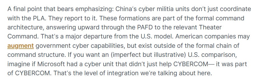 I’ll skip some of the content, though you should read it, to get to the final point: cyber companies can be/are integrated, at least partially, into the Chinese military/defense apparatus: