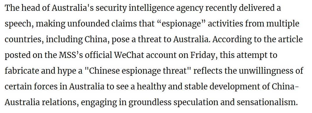 Australia, like every country, undoubtedly does collect intelligence and engage in espionage in China - the difference here is that China categorically denies ever doing so. The next step is pointing that out, in this case referring to the new variation of the “China Threat” theory: