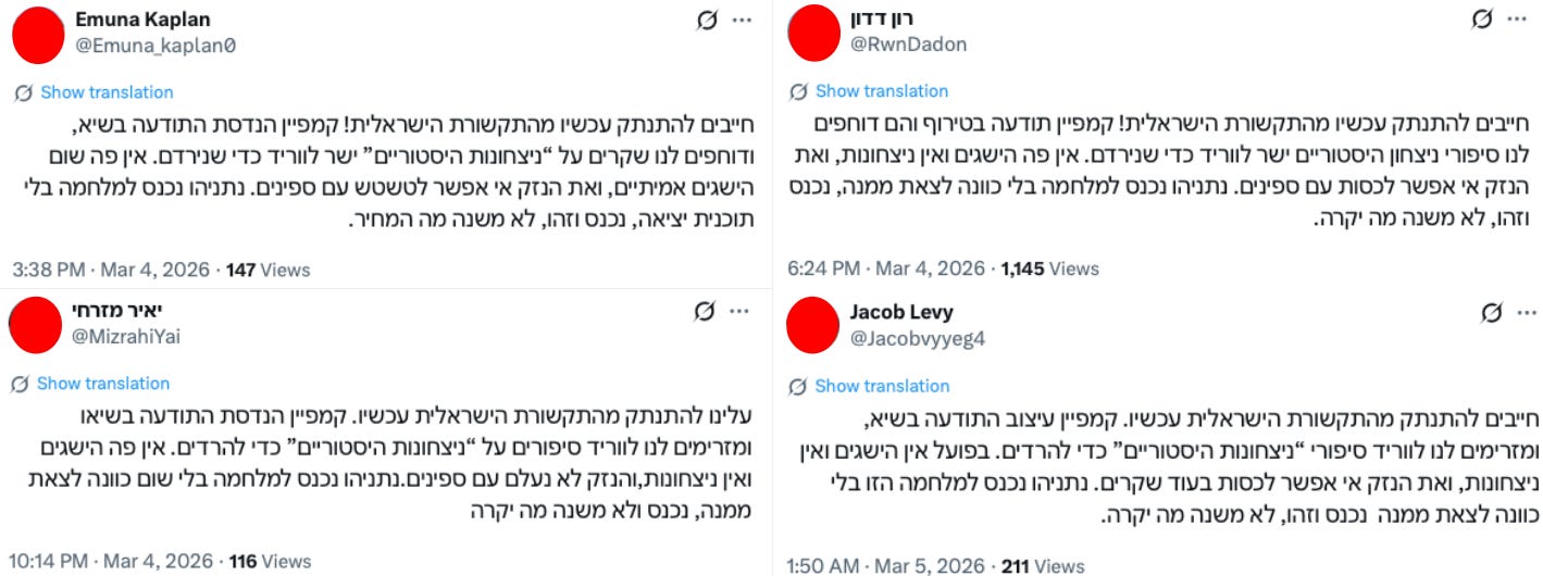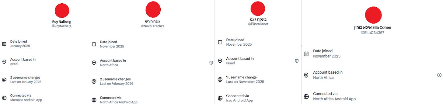 Between March 2nd and 9th, all 118 accounts in the network appeared to impersonate Israelis by posting Hebrew-language content speaking from the perspective of Israelis, and sometimes also by explicitly listing their location as Israel. 2 of these accounts, however, were no longer active as of March 30, 2026, i.e., @raphael95yair and @Poorbaby0.
