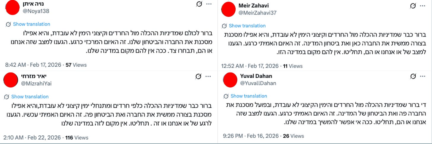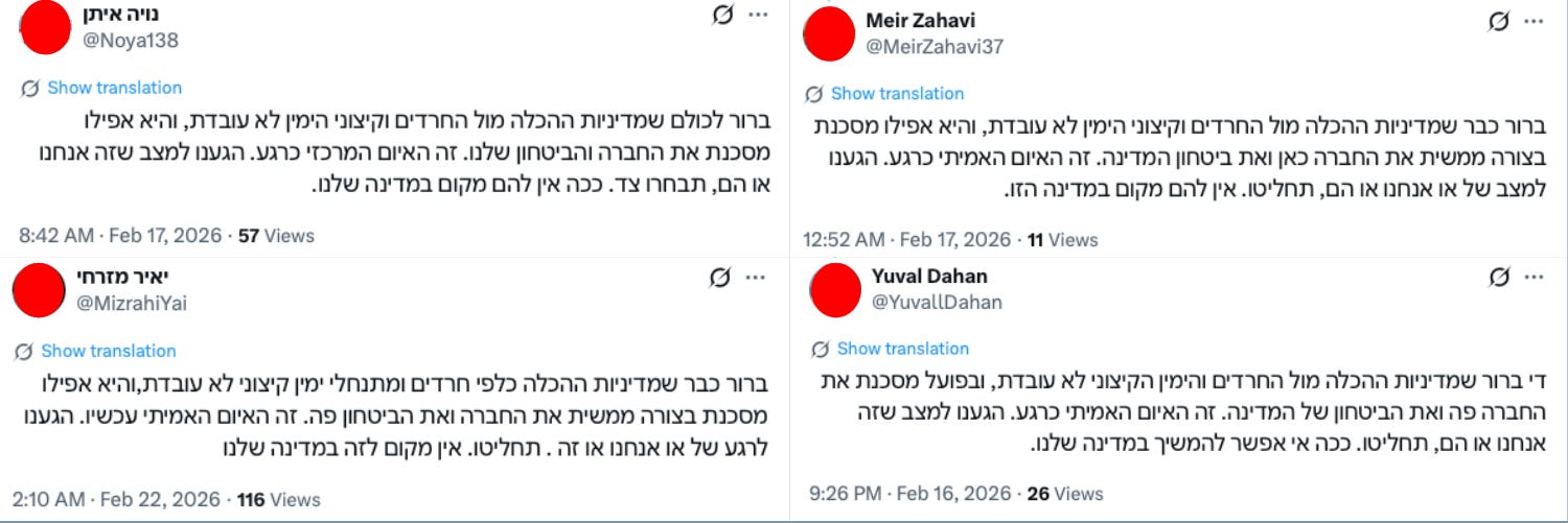 Another key narrative frames internal Israeli actors—especially coalition politicians, right-wing ministers, settlers, and Haredi political blocs—as threats from within and, often, as the greatest threat to Israel. Posts frequently claim that these actors pose a greater danger to Israel than Hamas or Iran, with a particular focus on Haredi draft exemptions and the influence of right-wing ministers. Some posts go further, explicitly comparing Israeli politicians to Iran’s rulers, claiming that “there is no difference between the Ayatollahs in Iran and those here.”