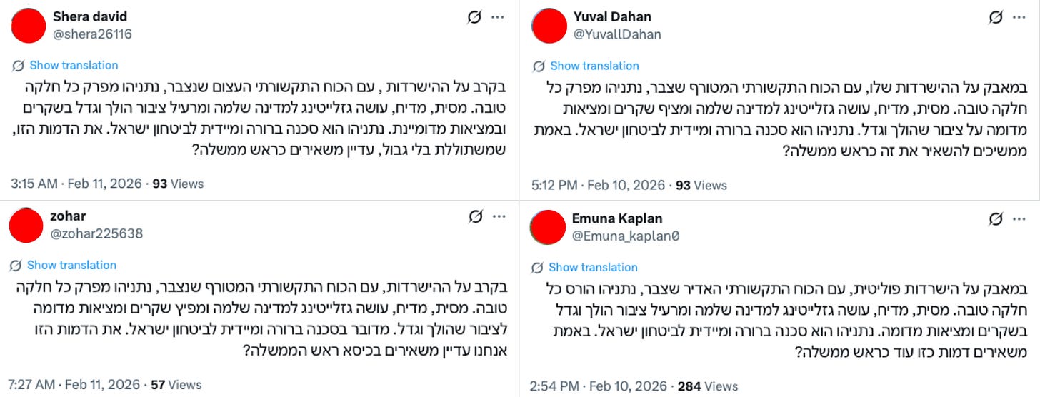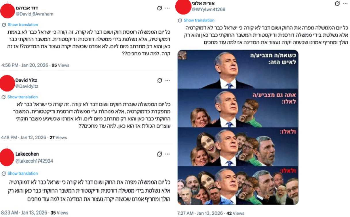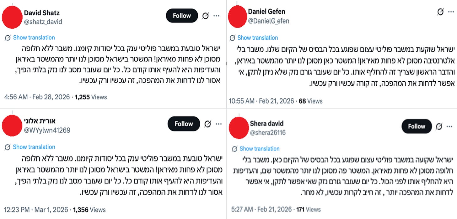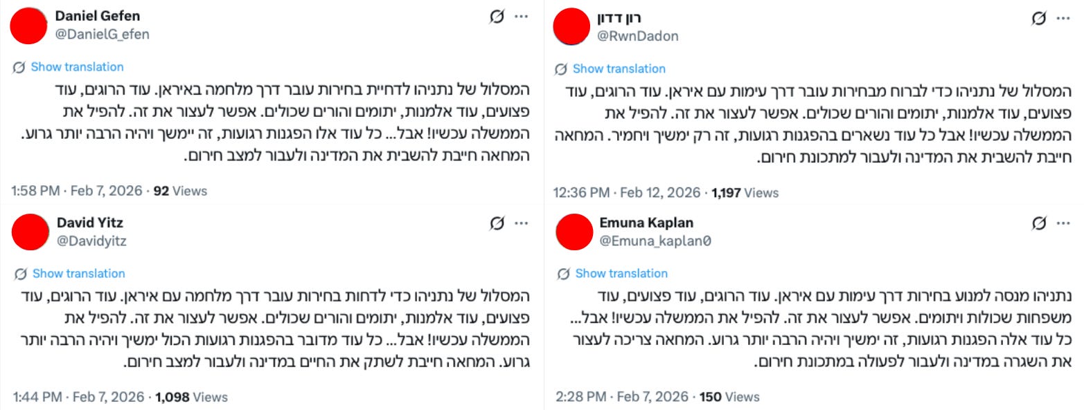 The largest coordinated content cluster includes Hebrew-language variants of a message stating that Israel is in an existential political crisis, that this crisis is as dangerous as Iran, that the Israeli government is more dangerous than Iran’s regime, and that immediate revolutionary action is necessary to overthrow it. This content was posted 22 times by 16 accounts in the network. Across these posts, the differences are limited to subtle changes in wording, register, and punctuation, while the overall structure and political message remain the same.