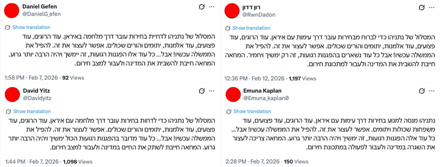 Another one of the network’s key narratives is that Netanyahu wages wars to preserve his power. Various claims include that the Israeli government is using war to distract the public, suspend elections, or create a permanent state of emergency.