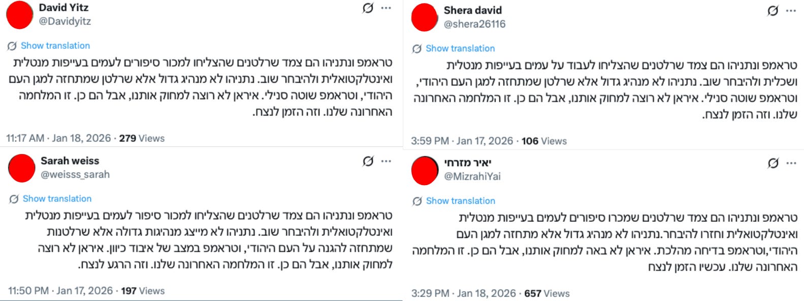 Figure: A sample of four posts from a coordinated content cluster claiming that Iran does not want to eliminate Israelis, but Trump and Netanyahu do.