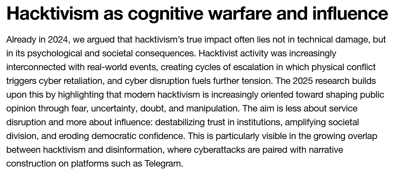 Orange Cyber Defense has put out a solid primer on hacktivist activity online, available here. Give it a read, but I want to point out one section - hacktivism is mainly useful as “cognitive warfare” than anything else: