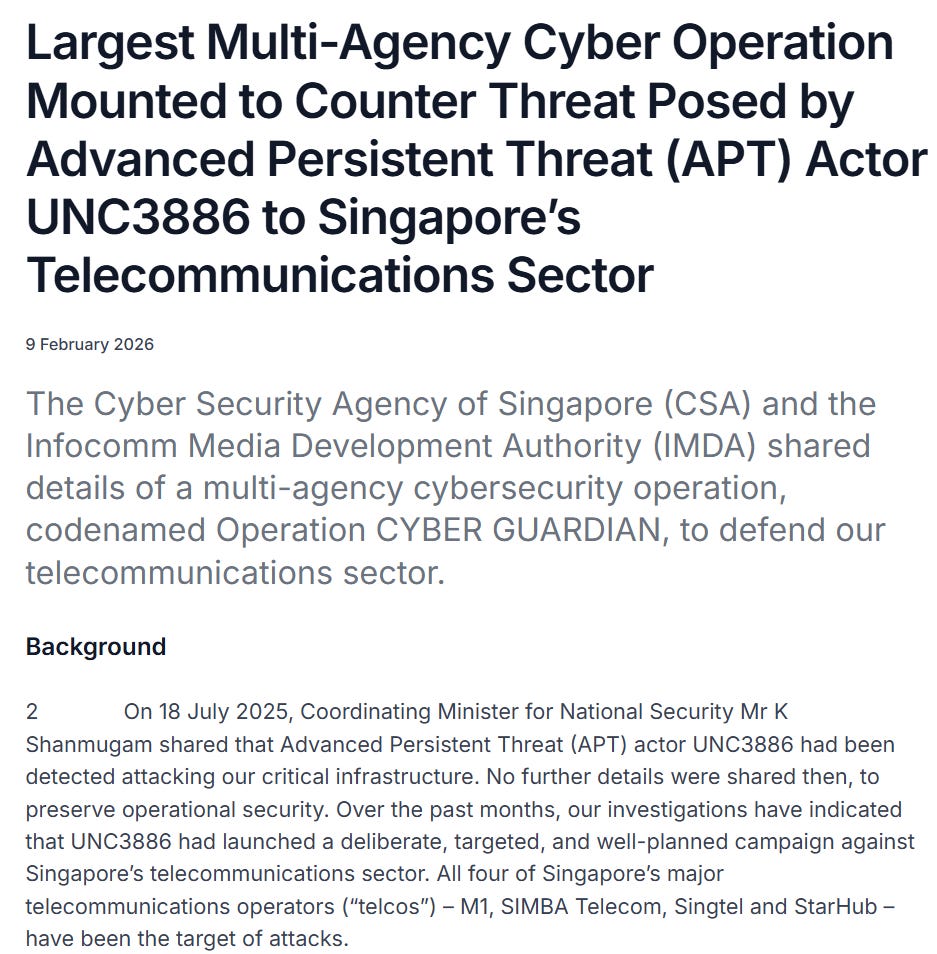 We’ll start this week with a quick tip of the hat to Singapore, which recently published a landmark advisory on Chinese hacking activity targeting its telecom infra.
