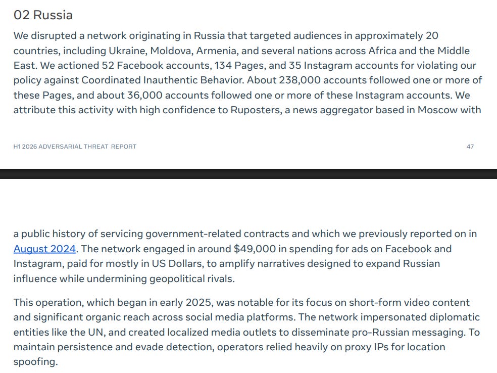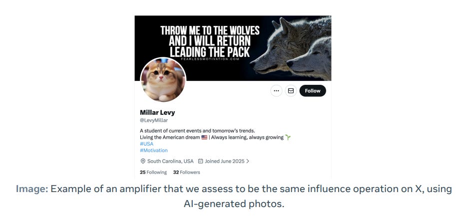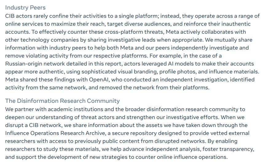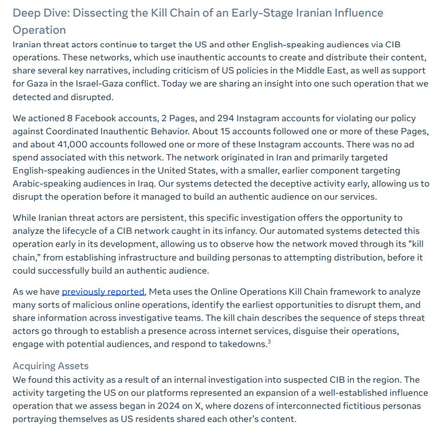 I’m opening this week’s post with a sad development: the time of death of Meta’s now semiannual threat report, available here.