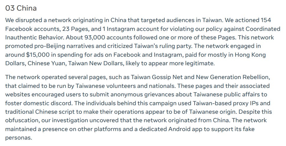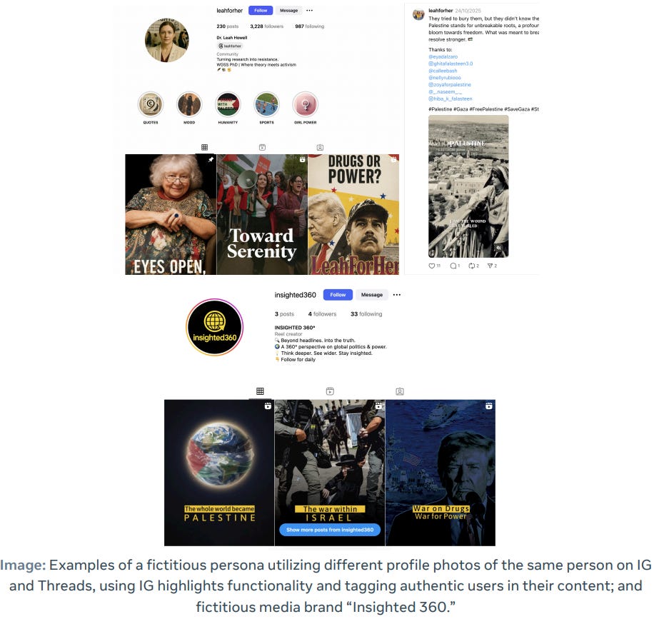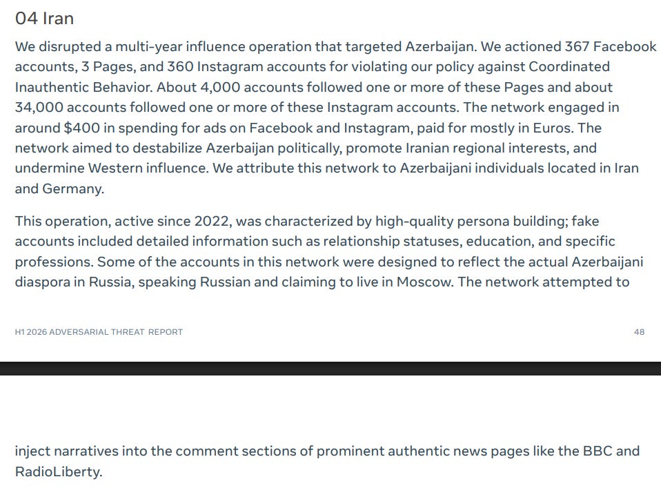 We also have one final Iranian operation targeting Azerbaijan. This one is interesting in that Meta found that it was run by two Azeris based in both Iran an Germany, as well as the long-running span of the operation and the “high-quality persona building” there.