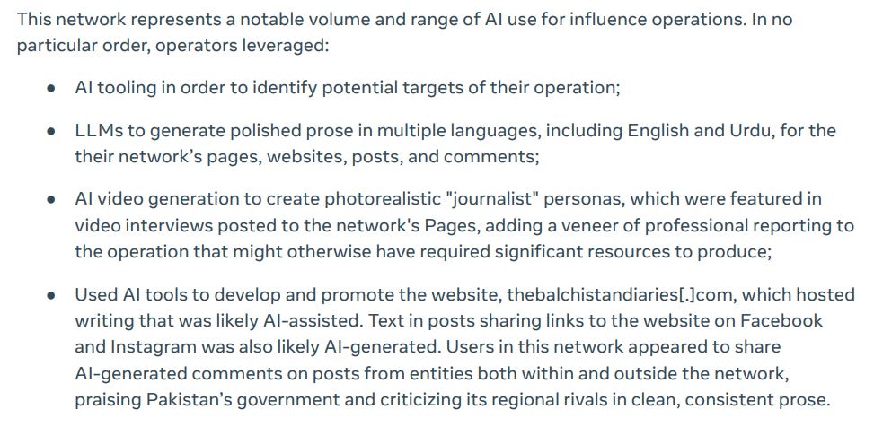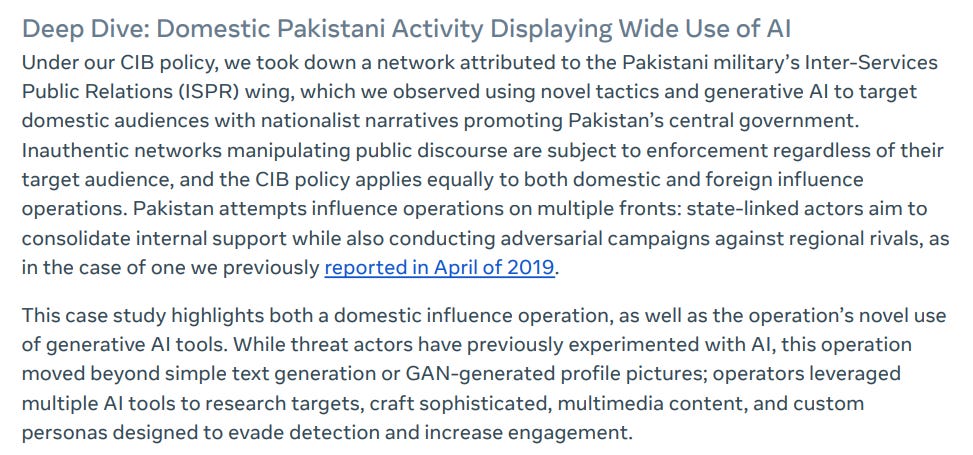 We also get some interesting insight into Pakistani domestic activity using AI. The use of AI meme cracks me up, as if it’s at all difficult to use AI nowadays.