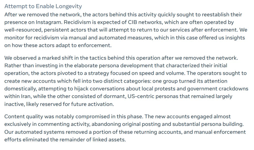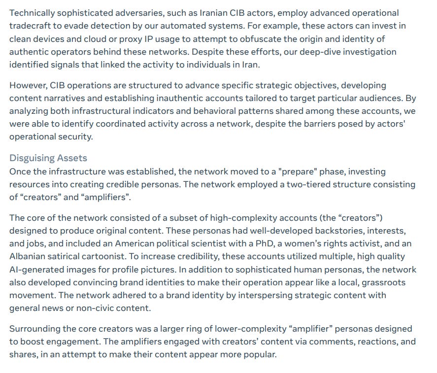 The information on the identities is interesting - we get political American figures, sure, but also an Albanian satirist, despite Albania not being mentioned in the rest of the report. I assume that the Albanian persona was meant to swing public opinion in Albania (a known thing that Iran focuses on due to the MeK being based there), so odd that Meta didn’t further expand on that.