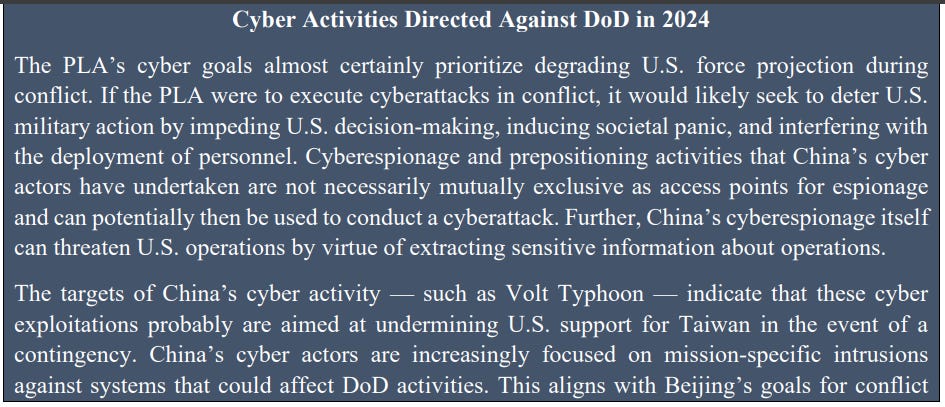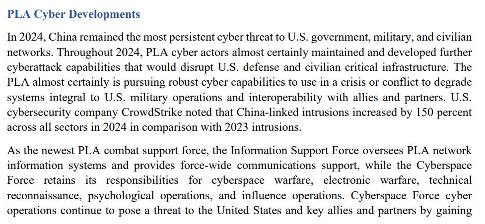 Point two claims that China conducts cyber operations to fulfill military and political goals, which is unsurprising. I also would say that aesthetically, the report isn’t great. I’m not a stickler for this usually, but official reports should look a bit better - official branding, better infographics and so on.