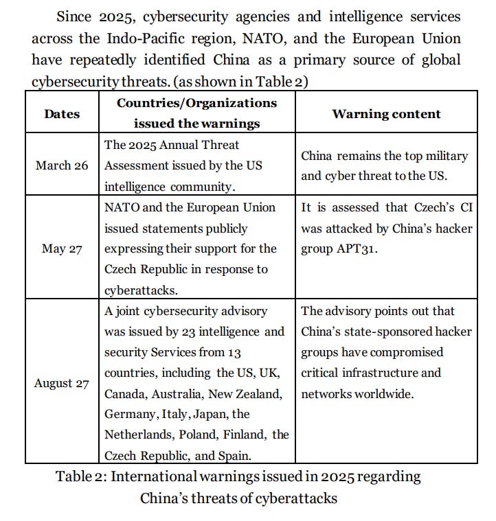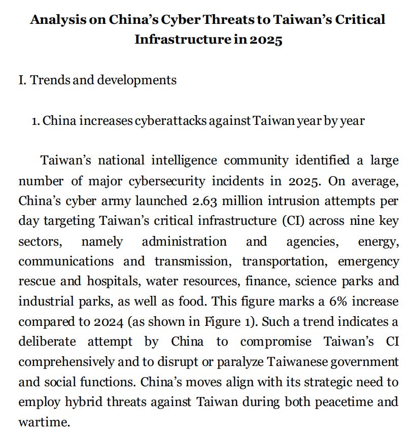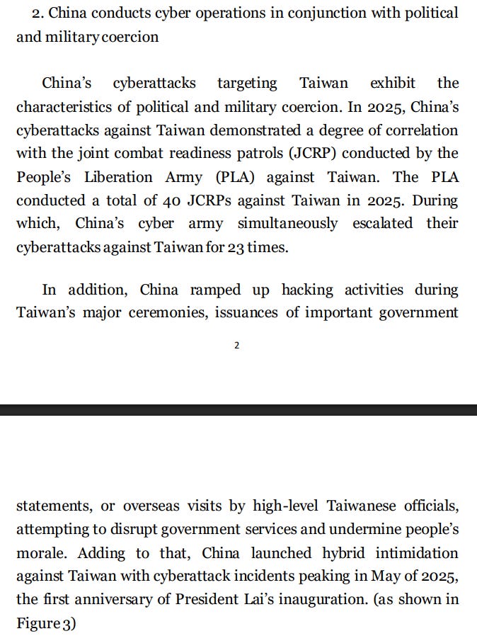 Firstly, this seems very much to be an attempt to counter Chinese stratcoms/IO regarding cyber activity and less of an actual CTI report or even typical government review of hostile foreign activity. The first page lays it out clearly, claiming that China has launched over 2.63 million “intrusion attempts per day” - a metric which I personally can’t stand and is reminiscent of past CVERC reporting, including things like port scanning as intrusion attempts. It looks unprofessional and isn’t really accurate.