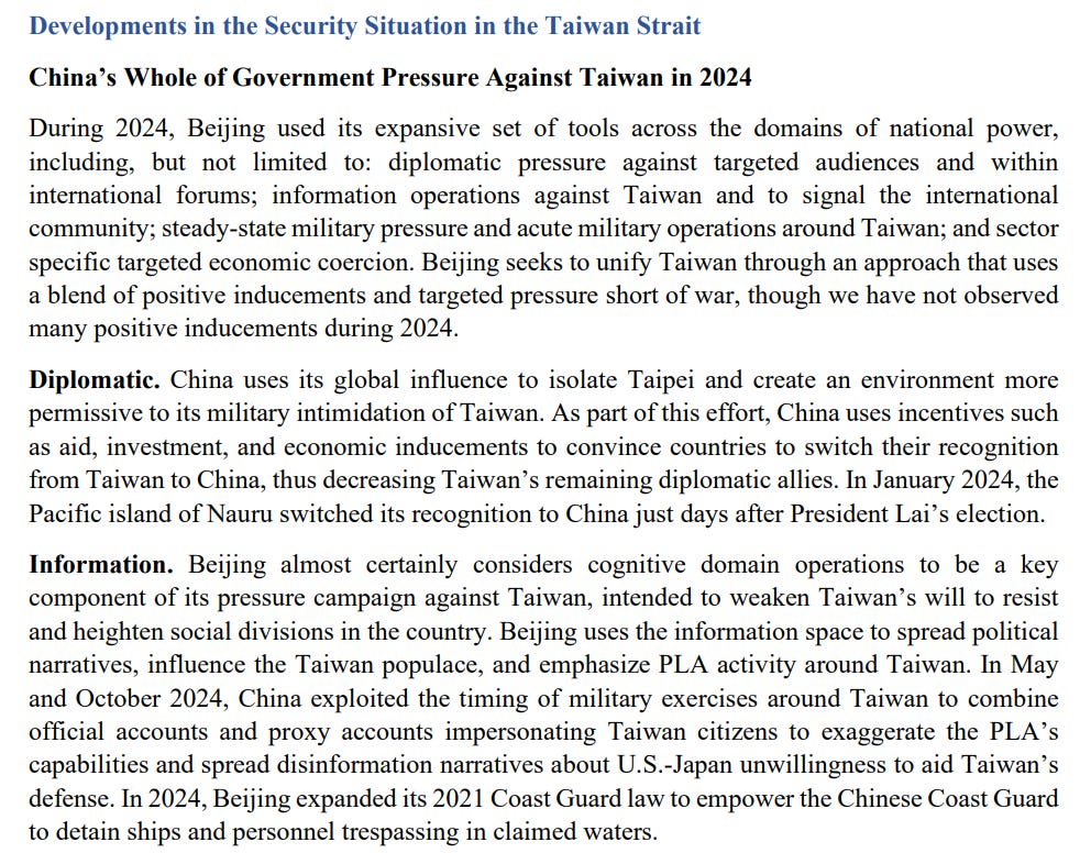 We also get some discussion of China’s “whole of government pressure” against Taiwan, showing how China views the “cognitive domain” as a key nexus of activity: