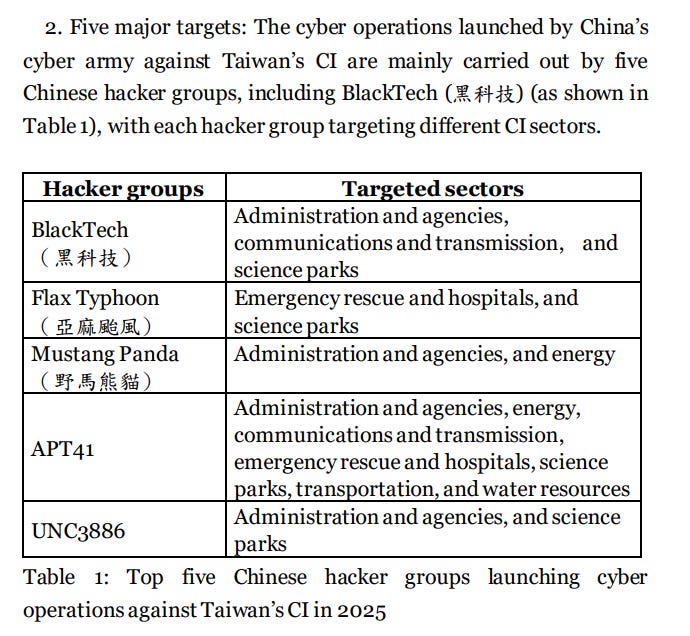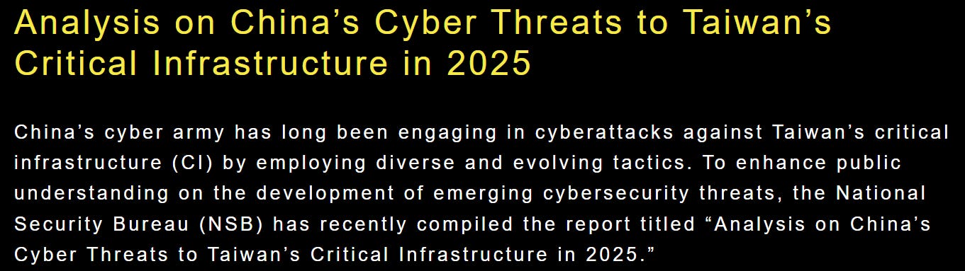 We’ll conclude with a recent report from Taiwan’s National Security Bureau on Chinese cyber threats, available here.