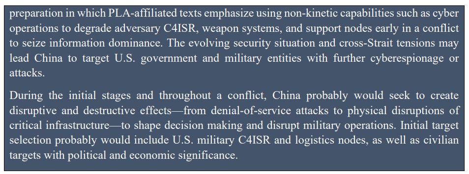 It’s also interesting to see a reference to how China would seek to create “disruptive and destructive effects” in case of war via cyber, such as DDoS attacks includnig against targets with “politial and economic significance” in an attempt to “shape decision making”. Essentially, believing that China would engage in cyber-enabled influence operations as part of actual quote unquote cyberwar.