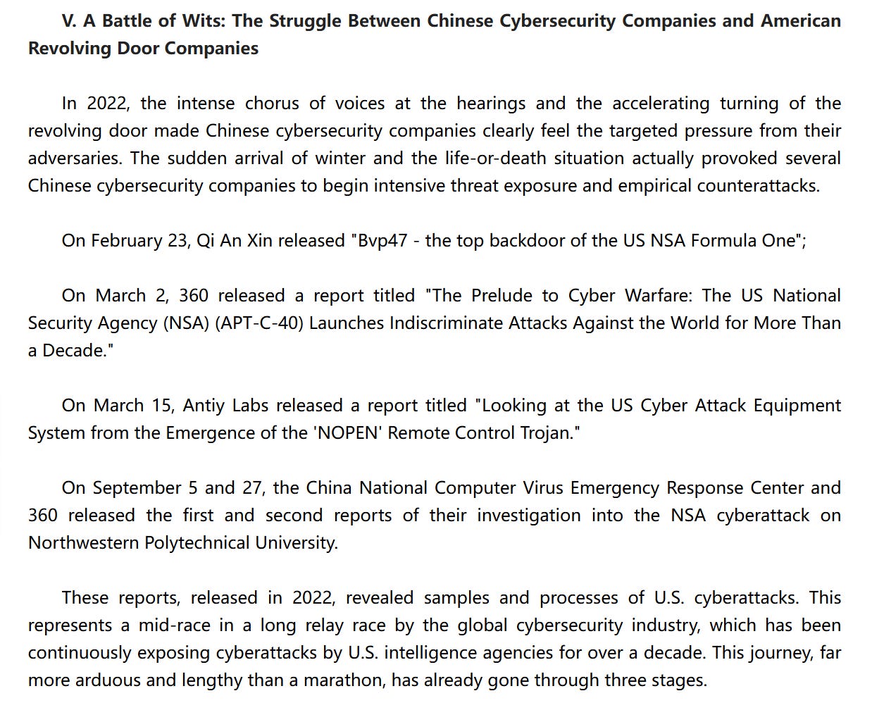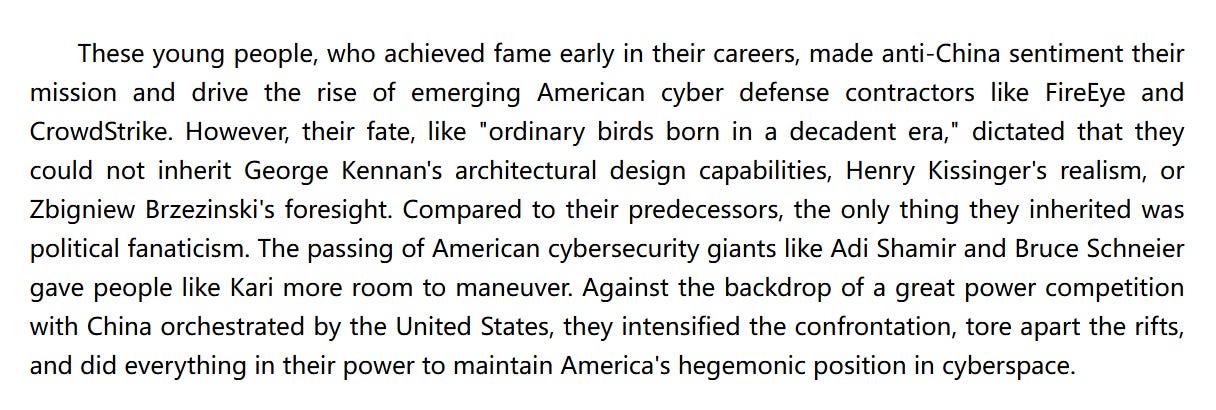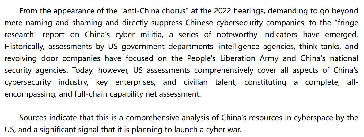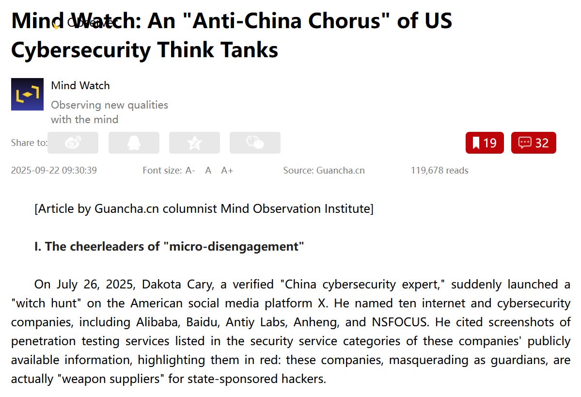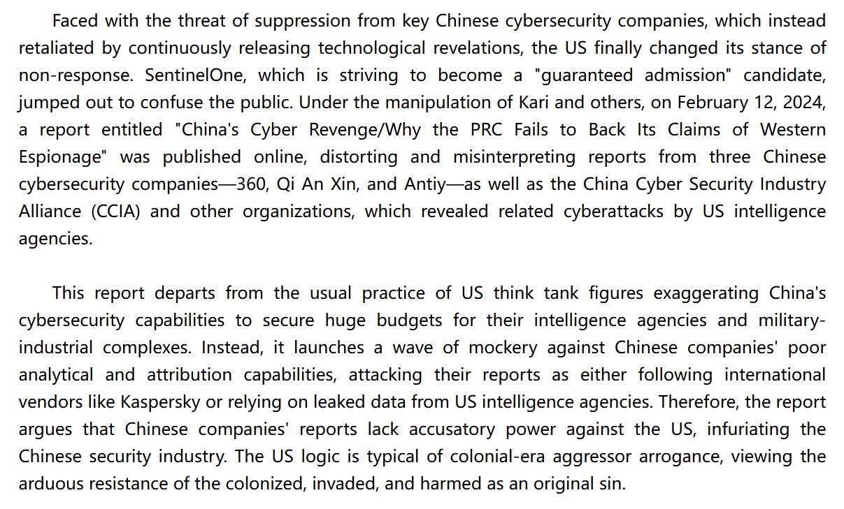 The report describes the US as feeling the “threat of suppression” from Chinese companies, which incentivized the US to change its stance. The article then accuses SentinelOne of being a key actor in the US’ plot here to respond, referring to Cary’s report in 2024 which discussed how China essentially makes up a lot of its cyber attribution work. Dynamic aside, the best part here is the last sentence, accusing the US of having a logical process that is “typical of colonial-era aggressor arrogance, viewing the arduous resistance of the colonized, invaded and harmed as an original sin.”