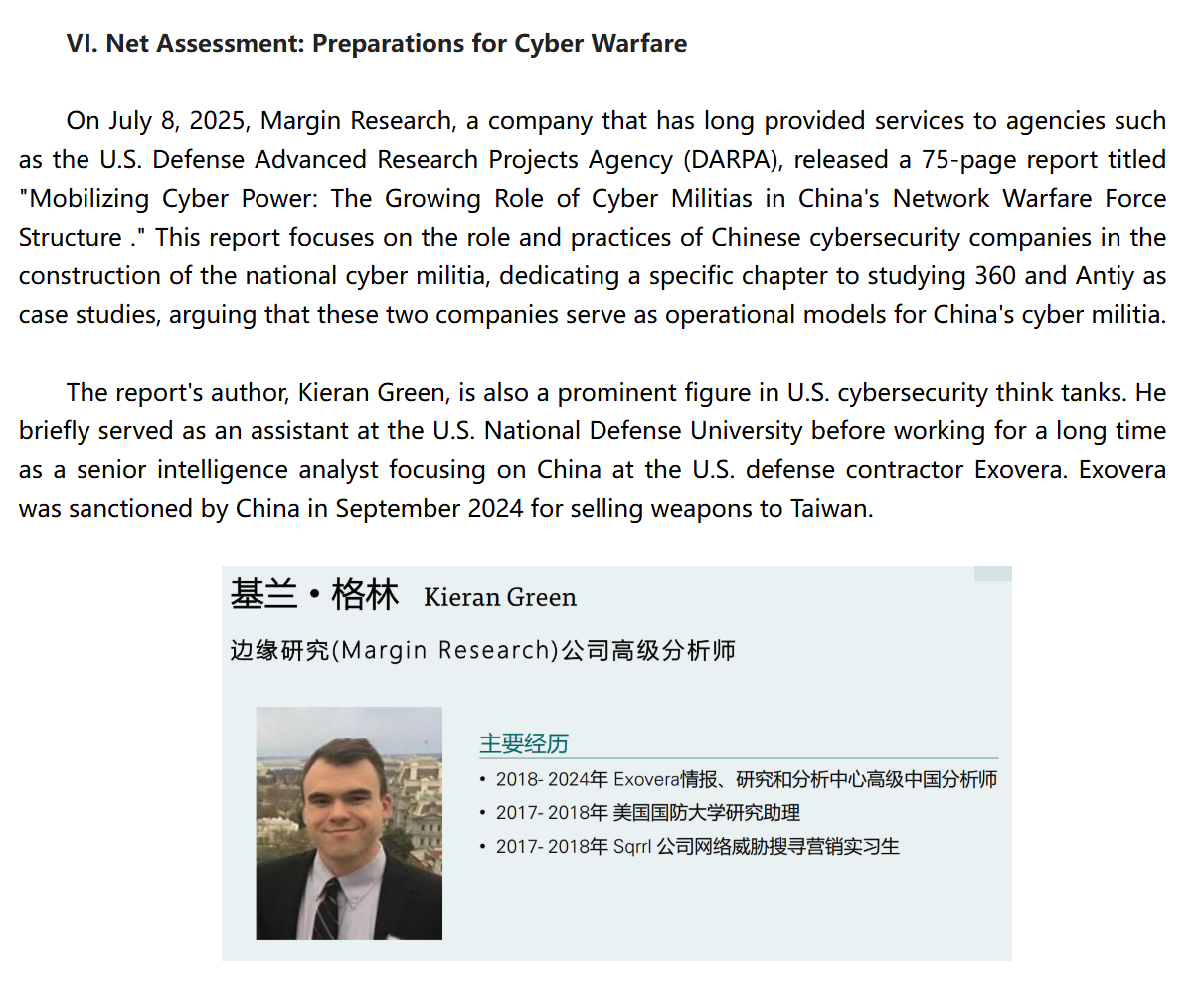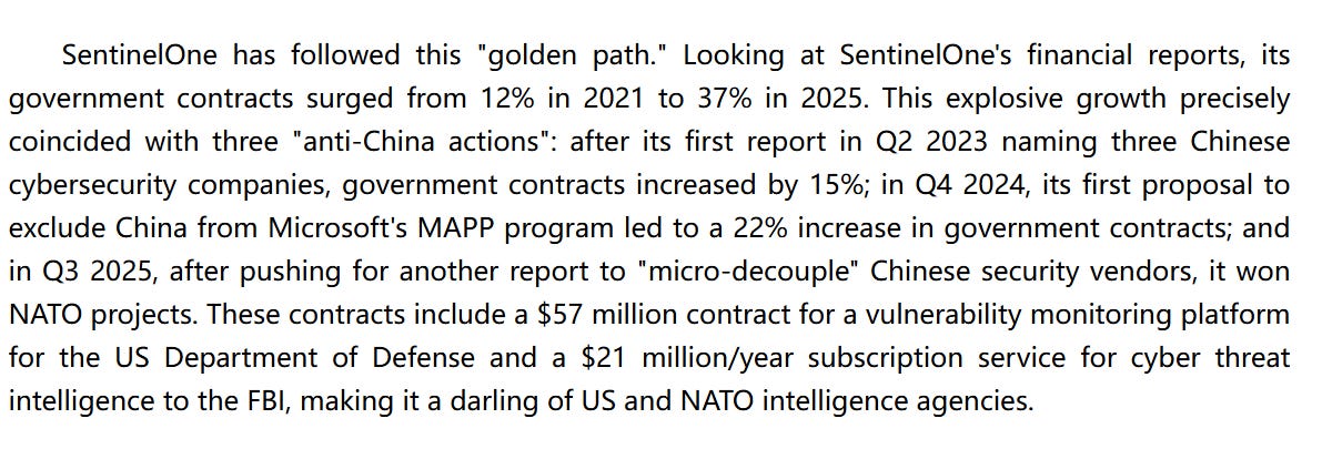 Beyond just listing information regarding the analysts, the article also accuses Sentinel One of pushing Microsoft to kick China out of MAPP in order to win contracts - a highly similar narrative to past CVERC reports: