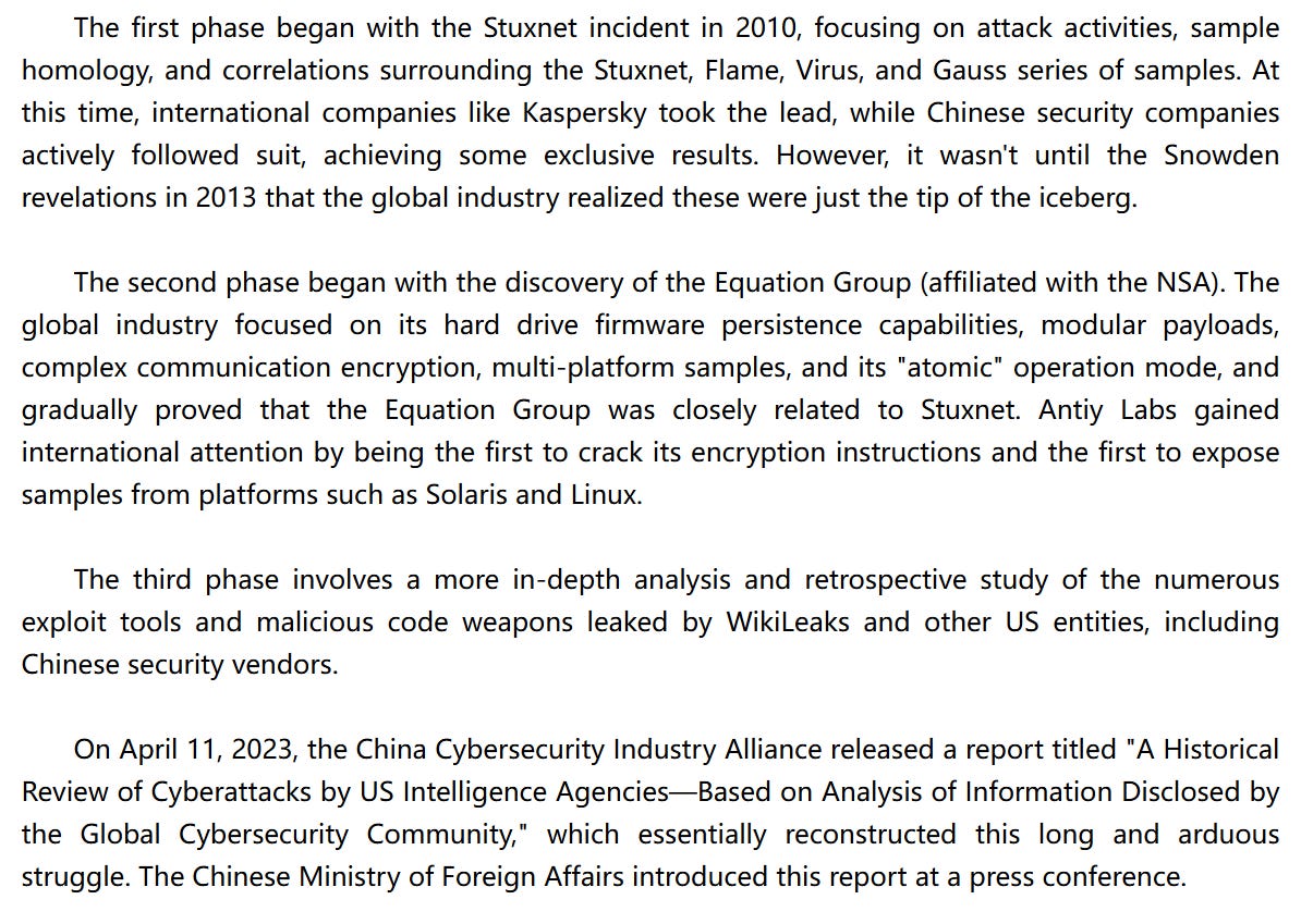 They break it down into three stages, the first being the exposure of alleged US operations and the Snowden leaks. Stage 2 began with the discovery of the “Equation Group”, the Kaspersky name for the NSA, presumably TAO if my memory doesn’t betray me. The article talks about how Antiy Labs apparently was the first to provide samples from some Equation group operations. The third phase refers to Chinese analysis of content from WikiLeaks, which IMO is a bit weird in its timing and phrasing here, but appears all of the time in Chinese cyber reporting. We even get a note referring to how the Chinese MFA builds on these and presents reports on these “phases” to the public:
