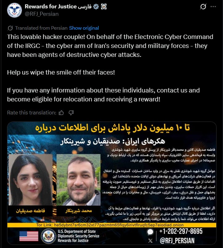 We’ll conclude with the DOJ and Rewards for Justice, which have been killing it lately with exposure of hacktivist IO activity, ranging from Iran: