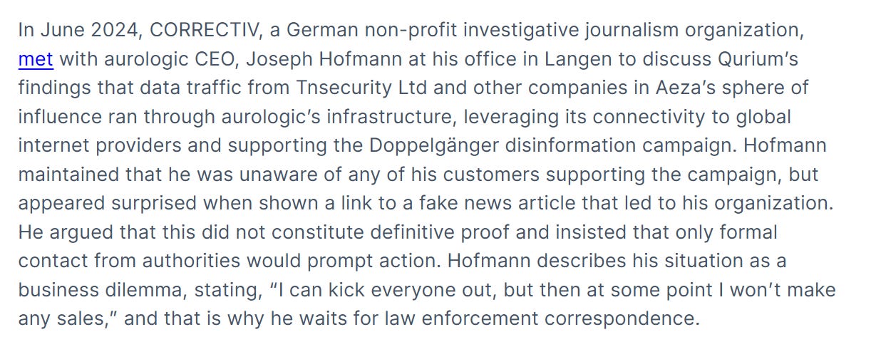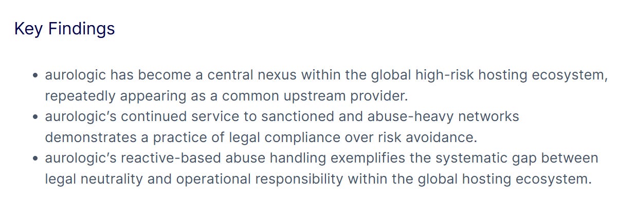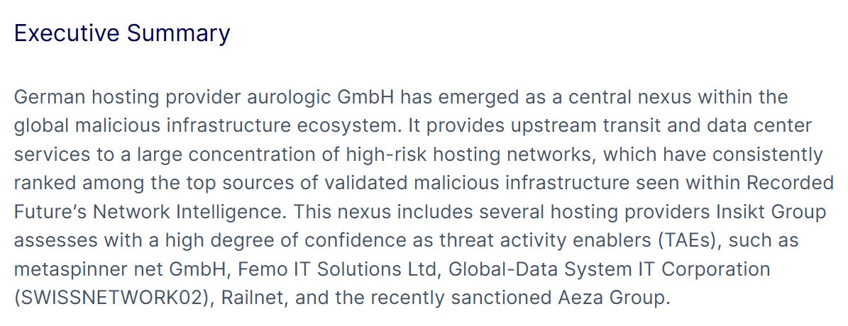 I’ll share the first paragraph for some context. The report looks at German hosting provider Aurologic, which allegedly services and “enables” other malicious hosting infrastructure (I personally like the new labelling of TAE):