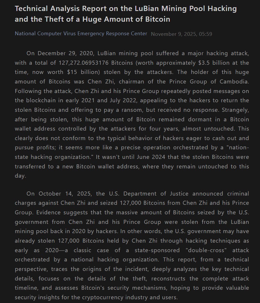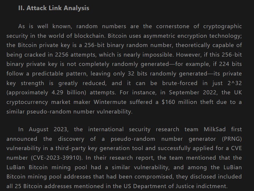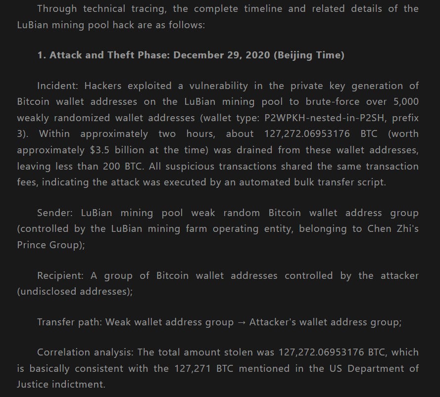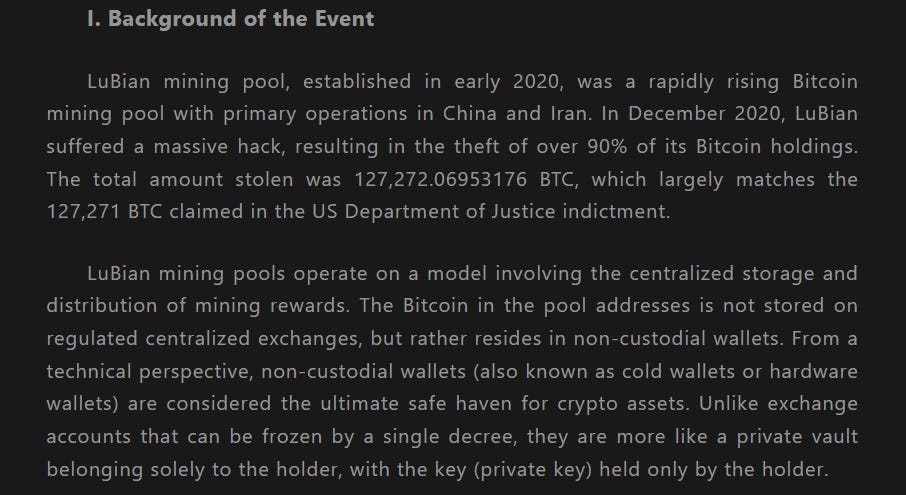 CVERC provides some background on the LuBian mining pool, which was apparently big in China and Iran. It had over 127,000 BTC stolen, roughly the amount that the DOJ later announced that it seized.