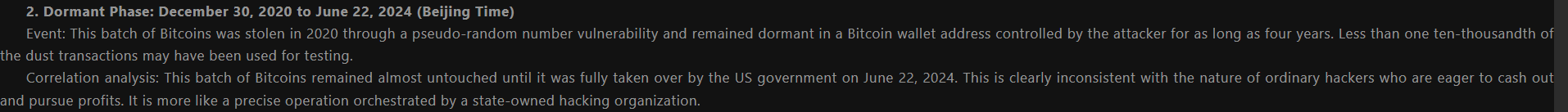 In terms of hard proof, there isn’t any. One of the sections claims that the funds weren’t touched for several years until seized by the US later in 2024. The CVERC claims that this is “clearly inconsistent with the nature of ordinary hackers who are eager to cash out and pursue profits. It is more like a precise operation orchestrated by a state-owned hacking organization”.: